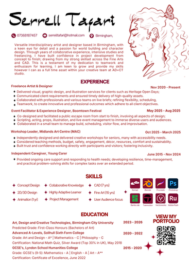 This drawing is one of my favourites because it represents me a lot - my identity as a person and artist - and all the elements that inspire me. I love it. I want it to be the first thing in my portfolio, but the current placement and black background aren’t working. I should make mood boards of textures, colours, patterns, and themes to help refine my design choices. Another useful idea was creating different iterations of my CV and portfolio tailored to different roles. Like Freya said, I have multiple pathways. Showing that experimentation on my blog , and documenting the thought process, could be really valuable..