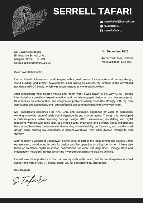 I struggled quite a bit making the cover letter for the first time. I found some templates given by Sadie, one of the career advisors, over a year ago, which luckily I still had. And it’s hard to write one for a fictitious studio that I’m applying for.