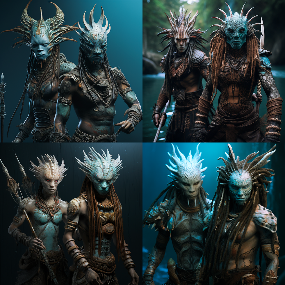 To be honest I only liked a very few of these because most of them did not understand the promnts or what I was actually envisioning, however they are beautiful nevertheless from a design perspective. Its interesting how it fused elements of my drawings too with the coral headresses thick locks of hair. Also It seems AI really struggles to understand ' happy, and ' peacefuul' in an alien setting.