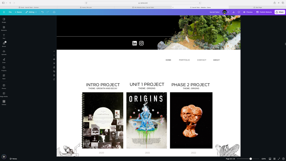To include all the work I did since the start of this course in September 2023 was a lot, and I didn't want to do it at first. I could have used a similar structure to my A-Level work where I spread images it out virtically, but I soon figured out how to embed presentations into my site through a live Canva link. This allows me to effectively showcase a lot of the work, progression and skills I developed throughout the years, in a short amount of space and time; it gives viewers the option easily invest or move on to the next thing. The result is very satisfying, and it synchronises any changes made on Canva live.